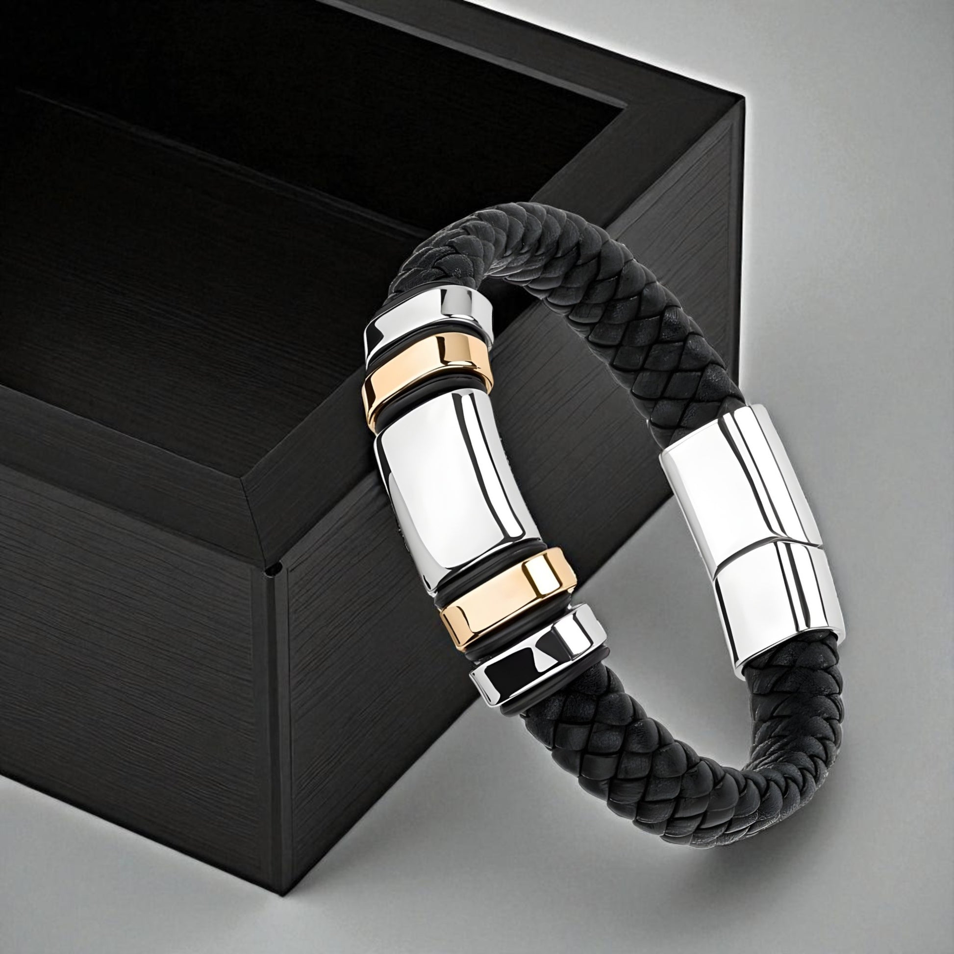 Sutil y sofisticado. Combina la fuerza del metal con la distinción y elegancia del cuero negro, creando un accesorio que destaca con estilo propio.